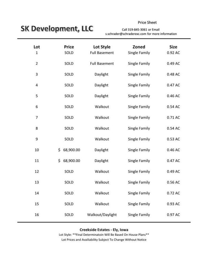 We have the pleasure to announce the availability of our newest development in Ely, IA. This development consists of 16 lots from 0.46 Acres to 0.97 Acres. These lots are going fast as we are down to only 2 available, so get ahold of us and make your reservation.